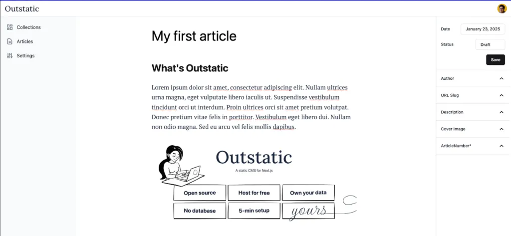 • Hébergé directement dans le projet : Outstatic s’intègre directement à votre projet Next.js. Pas de service externe ou de déploiement séparé.