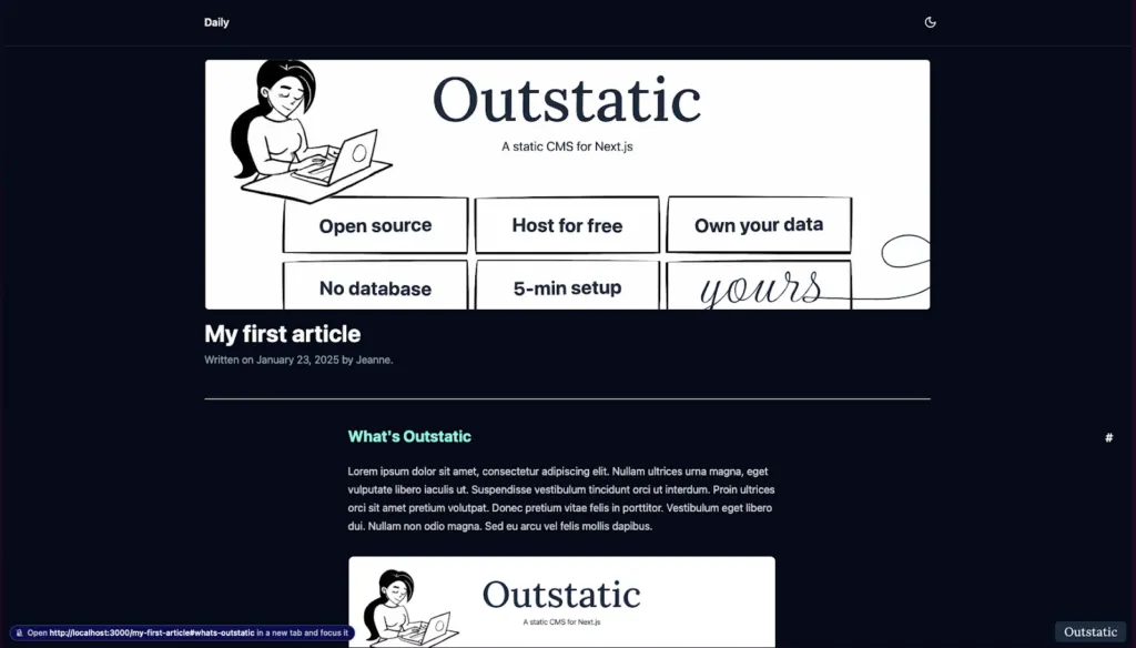 Article en écriture avec Outstatic VS le résultat sur le site