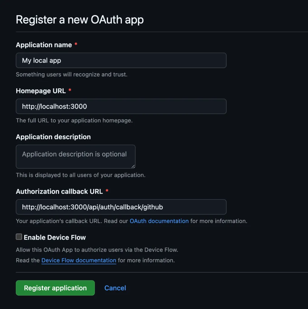 • Authorization callback URL : Ajoutez /api/auth/callback/github à votre URL (par exemple, http://localhost:3000/api/auth/callback/github).